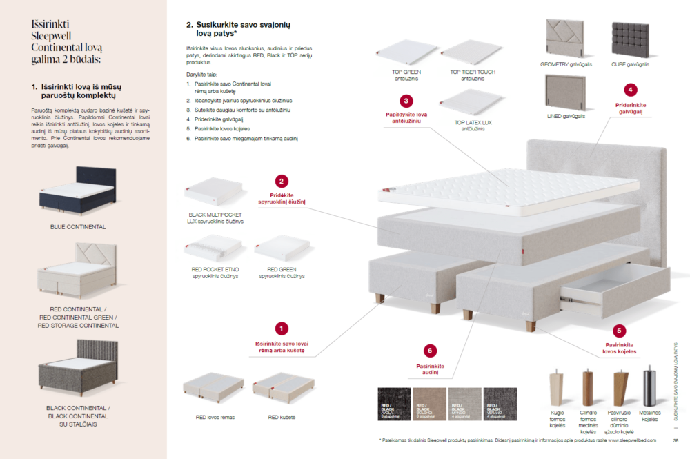 Vienas įdomiausių naujosios kolekcijos papildymų – galimybė savo svajonių lovą susikurti patiems, derinant tarpusavyje RED ir BLACK serijų gaminius ir pasirenkant patinkančio atspalvio audinį iš mūsų plataus baldinių audinių pasirinkimo. Tai reiškia, kad patiems galima išsirinkti viską – pradedant lovos pagrindu, kojomis ir baigiant galvūgaliu.