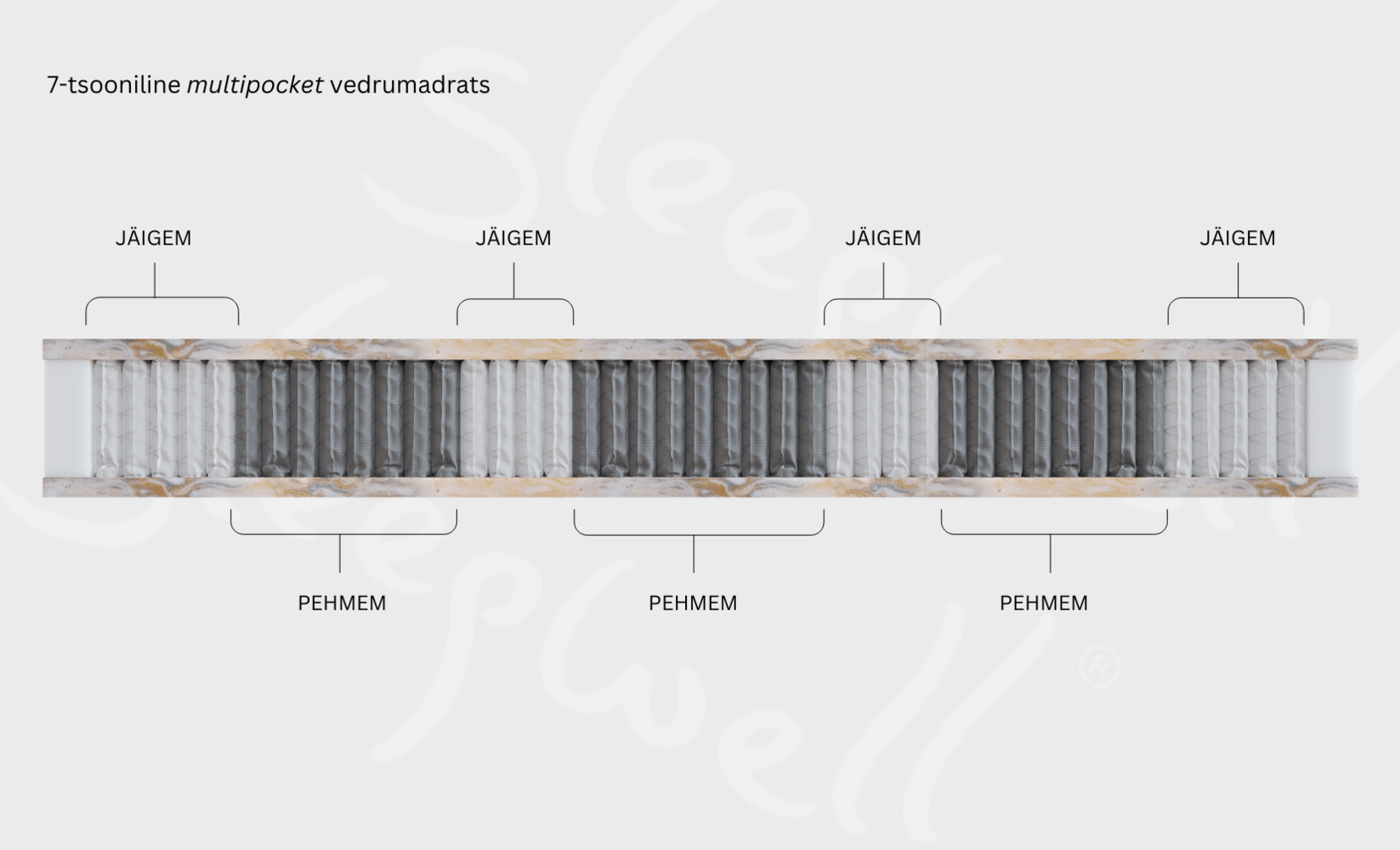 Spyruoklinis čiužinys yra su ypač patogiomis 7 zonų „multipocket“ spyruoklėmis. Galima rinktis kietą arba minkštą čiužinį. Vienoje spyruoklinio čiužinios pusėje yra natūralus lateksas, o kitoje pusėje – „Tiger Touch“ porolonas, kuris yra naujausias sprendimas medžiagų pramonėje. Jis pralaidus orui ir suformuojantis maloniai elastingą, kūną palaikantį pagrindą.